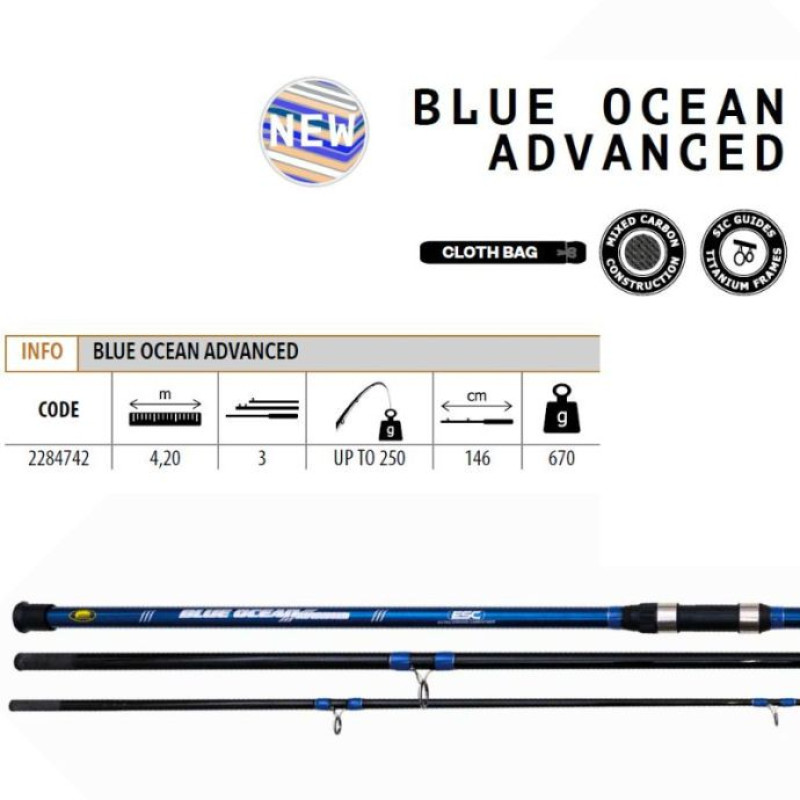 Jaunums Lineaeffe Blue Ocean Advanced 4.20m gara ar testu 100-250g ir 3 daļīga, tālās distances makšķere kura paredzēta makšķerēšanai jūrā, īpaši bušu ķeršanai. Tā ir aprīkota ar izturīgiem un viegliem SIC gredzeniem. Makšķere ir izgatavota no augsta moduļa IM 9 Carbon konstrukcijas, kas rada lielisku jaudas un dinamikas balansu metiena brīdī. Ideāli izmantojama makšķerējot butes jūras krastā, kur nepieciešami iemetieni tālumā no 80-120 metriem, bet varēsiet izmantot arī citur. Makšķerei nokrāsota balta spicīte, kas atvieglo copes noteikšanu pat sliktos laika apstākļos.