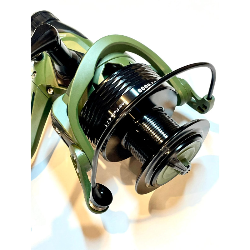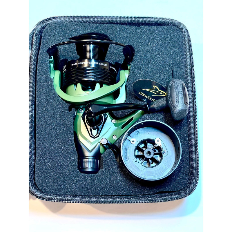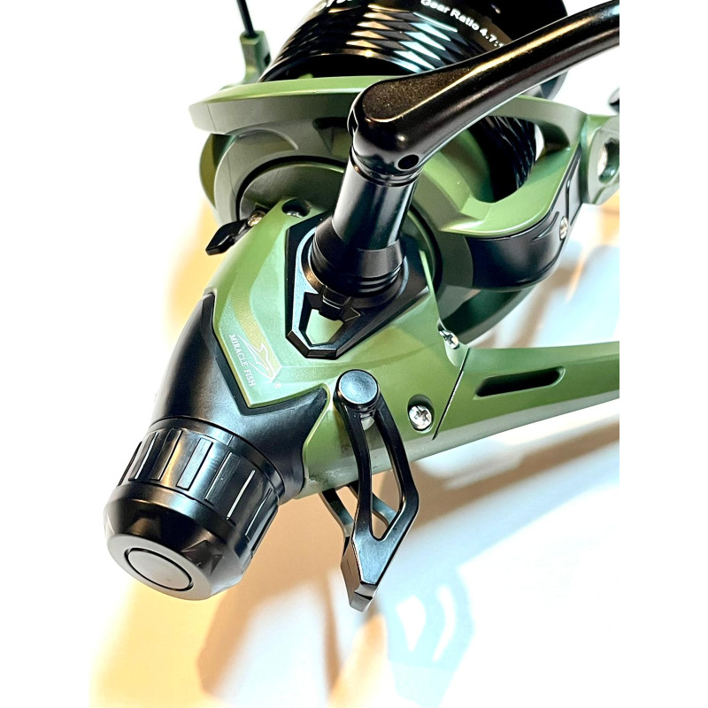Jaunums Miracle Fish Patriot 6000 - izturīga makšķerspole kas aprīkota ar Baitrunner sistēmu (brīvgaitas bremzi), kas ļauj šo spoli izmantot karpu ķeršanai, feeder makšķerēšani, gruntenēm, utt. Viegla grafīta konstrukcija ar pastiprinātu galveno pārnesumu. Duralumīnija auklas kasete un ar dzelzs drošības klipsi, komplektā plastmasas kasete. Pastiprināts rokturis. Jaudīgs un izturīgs zobrats nodrošina klusu un vienmērīgu darbību. Šai ārkārtīgi stabili konstruētajai spolei ir pastiprināts spoles svārstību mehānisms un palielināts zobratu diametrs un biezums