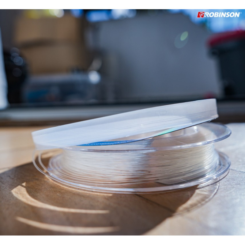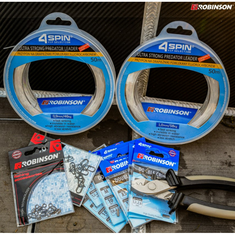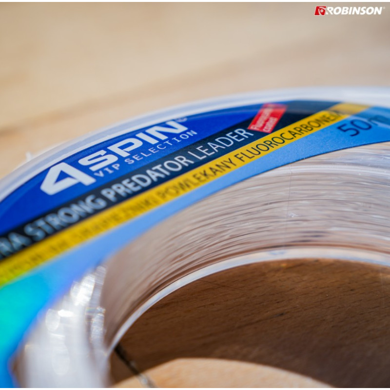Robinson 4Spin pavadu materiāls ar fluorokarbona pārklājumu 50m 0,9mm/ 46kg un 1mm/ 58kg, kas paredzēts makšķerniekiem, kuri paši veido savas sistēmas plēsējiem. Tas ir ideāls risinājums līdaku pavadas un izturīgas samu sistēmas izgatavošanai. Materiāls apvieno ārkārtēju lineāro izturību ar izturību pret mehāniskiem bojājumiem. Augsta nodilumizturība: Materiāla virsma ir izturīga pret berzi no akmeņiem, gliemežiem,nogrimušiem kokiem vai asiem līdaku zobiem. Pavadu materiāls ļauj izveidot jebkura garuma pavadas, kas ir lieliski piemērotas jūsu konkrētajai makšķerēšanas tehnikai (spiningam, velcēšanai, makšķerēšanai Norvēģijā). Kā arī neaizstājams lielu mīksto mānekļu aprīkošanai, stingeru veidošanai un smagu grunts sistēmu izveidei samu ķeršanai.
