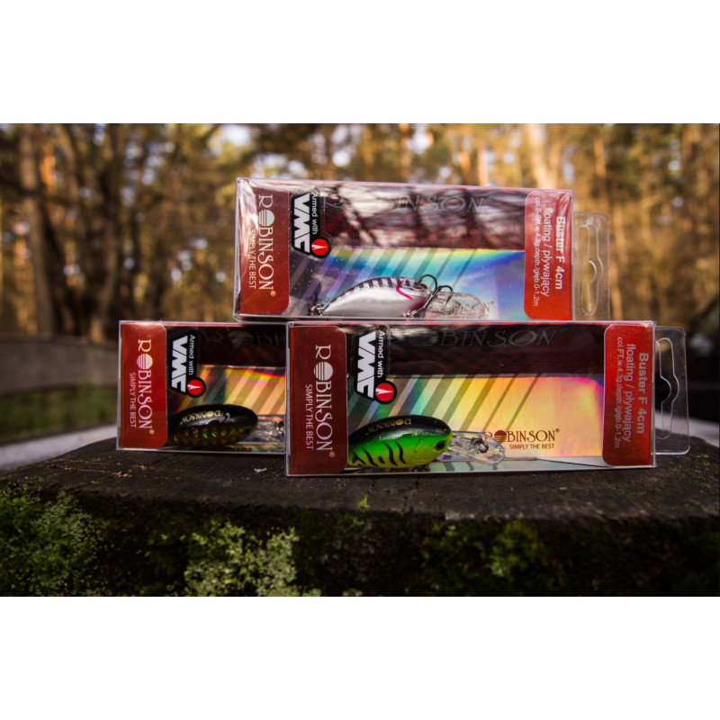 Vobleris Robinson Buster 4cm 4g ar iegrimi 0-1.2m ir īsts retums jebkura spiningotāja arsenālā, kurš dod priekšroku foreļu, sapalu vai asaru ķeršanai. Tam ir ļoti ātra un agresīva darbība. Pateicoties mēles dizainam, tas ātri ienirst zem ūdens. Šis mazais, gludais, tikai četrus centimetrus garais vobleris ir salīdzinoši smags, kas ļauj veikt tālus un precīzus metienus. Spiningošana ar plānu auklu straujās straumēs un lēni plūstošās upēs ir patiess prieks. Buster rūpīgi izvēlētās krāsas ir ievērības cienīgas, dodot priekšroku makšķerēšanai gan kristāldzidrās foreļu upēs (tumšas krāsas), gan mazāk caurspīdīgos ūdeņos (gaišas krāsas ar hologrāfisku pārklājumu).Vobleri aprīkoti ar 3D acīm un asiem VMC trīsžubura āķiem. Buster ir piemērots makšķerēšanai gan mierīgos, gan lēni plūstošos ūdeņos.