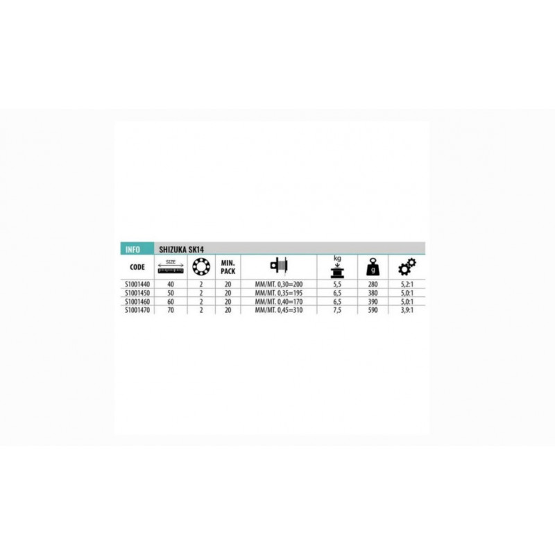 Shizuka SK14 50 ir universāla spoļu sērija, kura paredzēta dažādām makšķerēšanas tehnikām un vislabāk piemērota makšķerēšanai jūrā ķerot butes, kā arī gruntsmakšķerēšanai. Aprīkota ar diviem lodīšu gultņiem un līdzsvarotu rotoru, kas nodrošina gludumu un plūstamību gan mešanas, gan izvilkšanas laikā. Korpuss ir izgatavots no grafīta, tāpat kā kasete, kuru ražotājs jau ir aprōkojis ar augstas kvalitātes monofīlo auklu 0,35mm/ 195m. Uzlabota ar sāls apstrādi, šī spole iztur sālsūdens vides skarbumu, pagarinot tās kalpošanas laiku un apkopi.