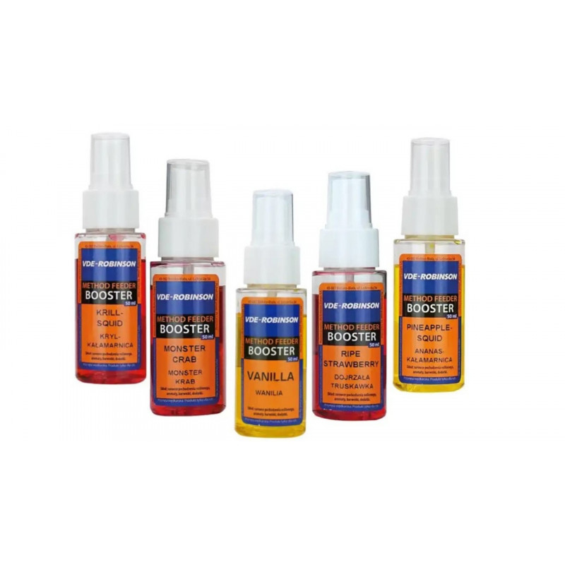 VDE-Robinson method feeder booster 50ml sērija, kas paredzēta method feeder,feeder un citiem gruntsmakšķerēšanas veidiem. Pieejami 5 visefektīvākajos aromāta un garšas variantos. To uzsmidzina tieši uz ēsmas vai barotavas. Īpaši izveidotā formula iedarbojas ūdenī nekavējoties un ātri pievilina zivis jebkuros apstākļos.Booster receptes ir balstītas uz dabiskas izcelsmes sastāvdaļām, pateicoties kurām zivis pēc uzsmidzināšanas tuvojas ēsmai ar ziņkāri un pārliecību. Šis booster palīdzēs situācijas, kad nepieciešams ātri atšķirt ēsmu uz grunts vai padarīt barotavas saturu pievilcīgāku. VDE-ROBINSON boosteri var kļūt par īstu "spēles noteikumu mainītāju" makšķerēšanas laikā!